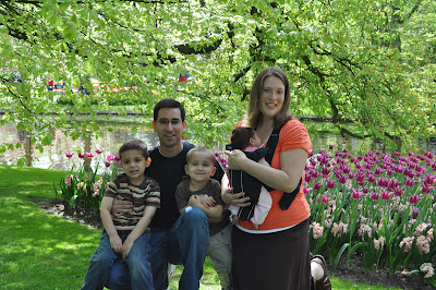 I forgot to mention in yesterday's installment that our long-time friends the Greens (who rather randomly moved to Wiesbaden two weeks after we did last summer) came with us to the Netherlands. They had a separate trailer at the same Eurocamp site so we got to see them a lot while we were on vacation. Our two families left around 9:30 Thursday morning for the twenty minute drive to the Keukenhof gardens. We passed some fields of tulips on the way there.